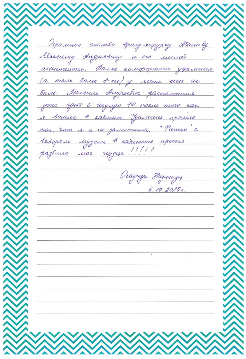 Большое спасибо за профессионализм и внимание к пациентам.»