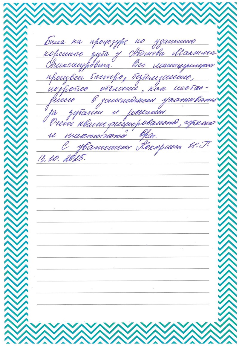 Хочется отметить аккуратность в проведенной процедуре, отсутствие крови. Также внимания заслуживает обращение с пациентом, создание благоприятной атмосферы и отсутствие напряженности.»