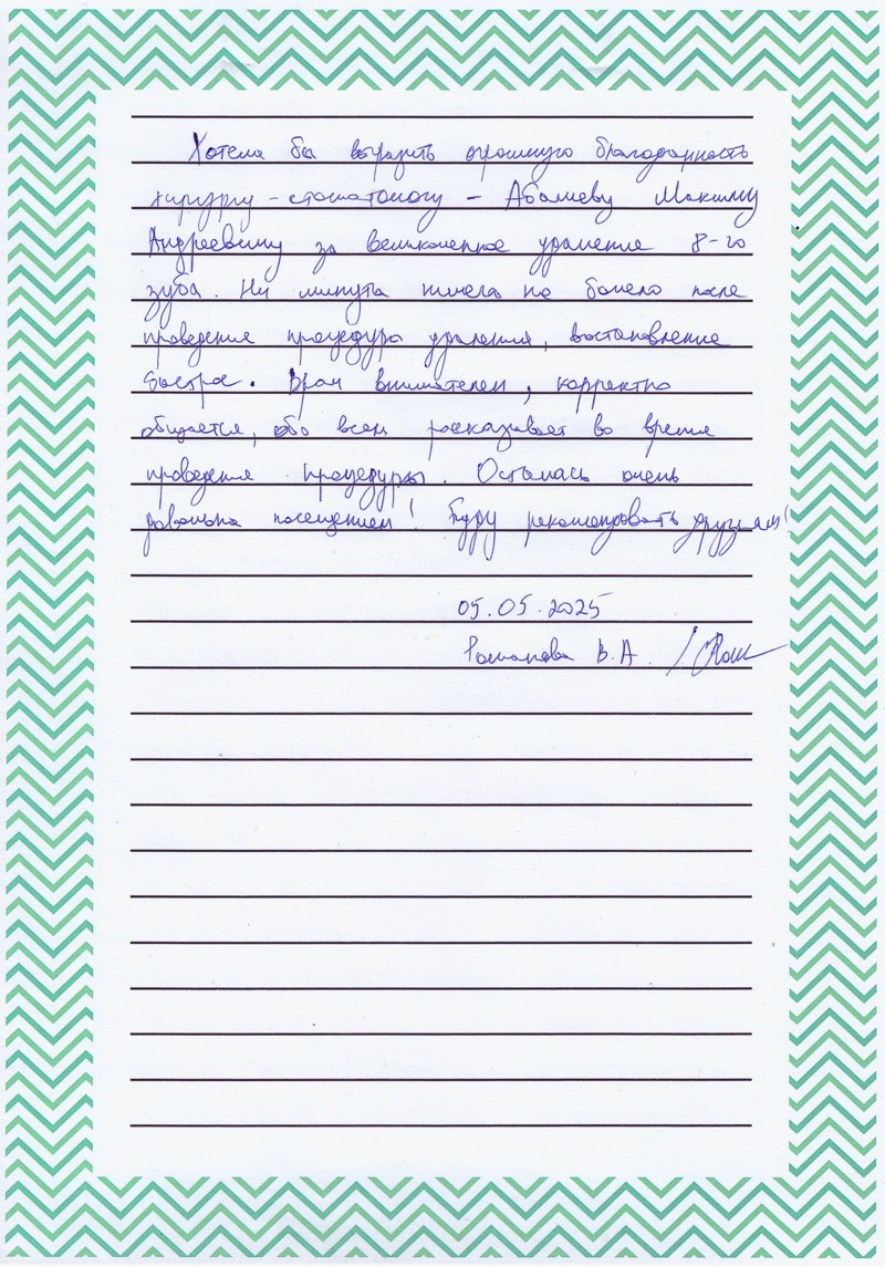 «Выражаю благодарность Абашеву Максиму Андреевичу за быструю и безболезненно проведенную операцию по удалению сложного зуба.