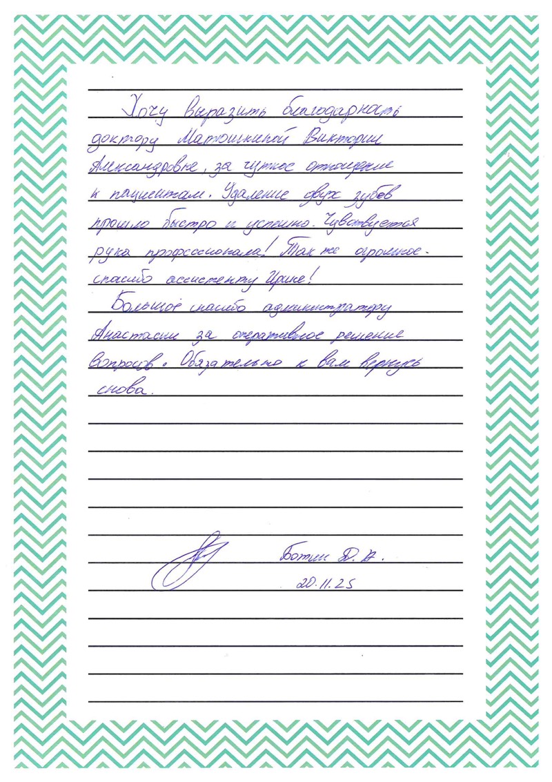 «Хочу выразить благодарность доктору Матюшкиной Виктории Александровне, за чуткое отношение к пациентам. Удаление двух зубов прошло быстро и успешно. Чувствуется рука профессионала! Так же огромное спасибо ассистенту Ирине!
