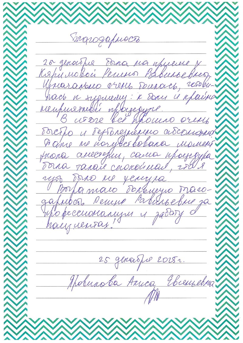 25 декабря была на приеме у Кяримовой Регины Равильевны.