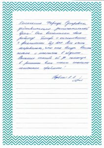 Вы необыкновенная женщина, с душевным, почти нежным подходом к каждому. Ваша доброта и компетентность, умение успокоить и дать каждому из ваших пациентов чувство, что все будет хорошо. Ваша улыбка, уверенность и мастерство врача, я думаю, многим людям помогло забыть дискомфорт в зубной полости. Вы талантливый человек в зубном деле. Желаю вам успехов в вашей работе и благодарю вас, за все, что вы для меня сделали !!!»