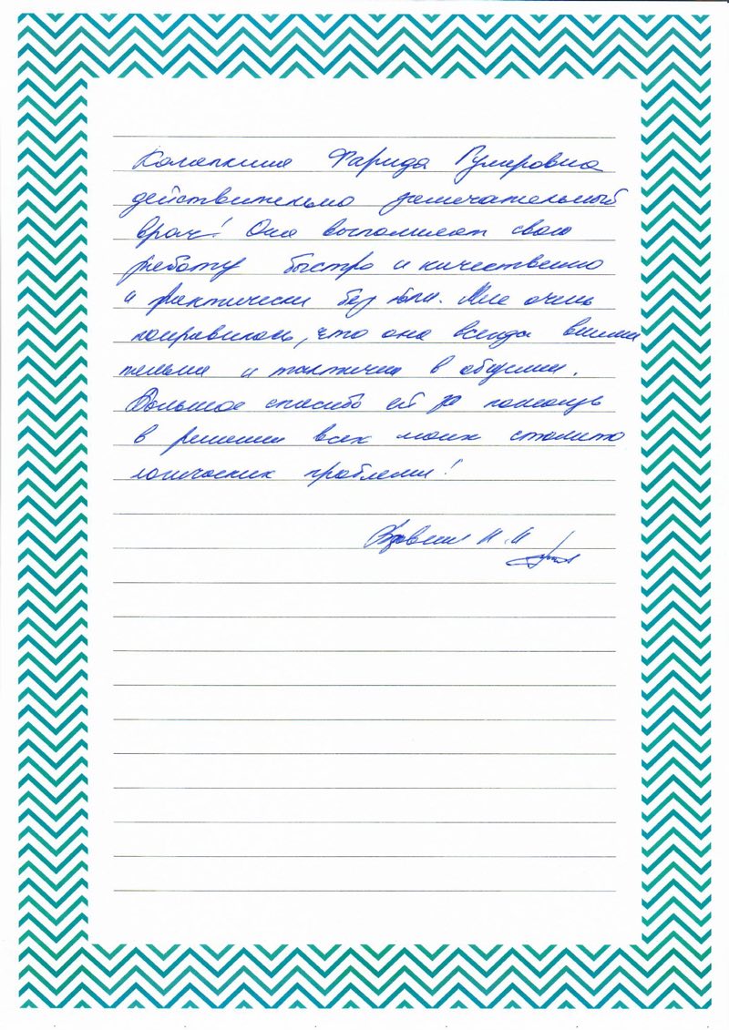 «Огромная благодарность Фариде Гумеровне за терпение, уважение к пациентам и ее помощнице Нине.»