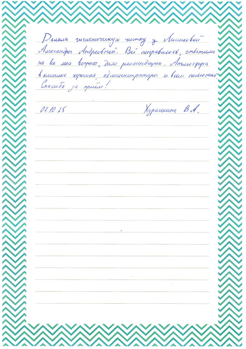 «Делала гигиеническую чистку у Лисенковой Александры Андреевны. Все понравилось, ответили на все мои вопросы, дали рекомендации. Атмосфера в клинике хорошая, администраторы со всем помогают.