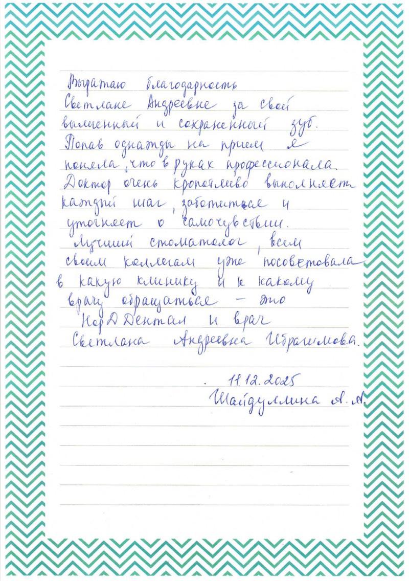 «Выражаю благодарность Светлане Андреевне за вылеченный и сохранённый зуб.