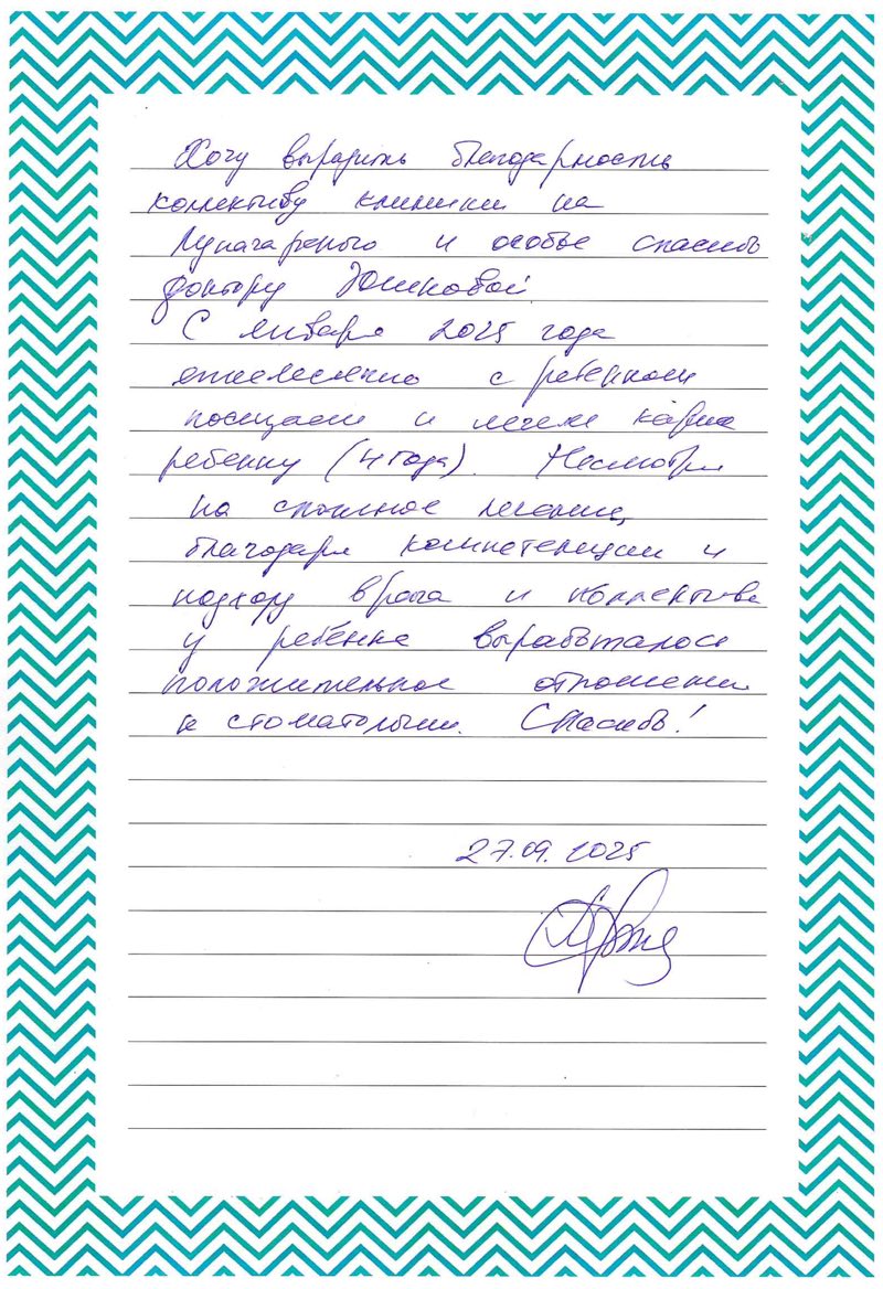 «Спасибо огромное врачу Юшковой Марии Викторовне за работу. Она вылечила моему ребенку 5 зубов,