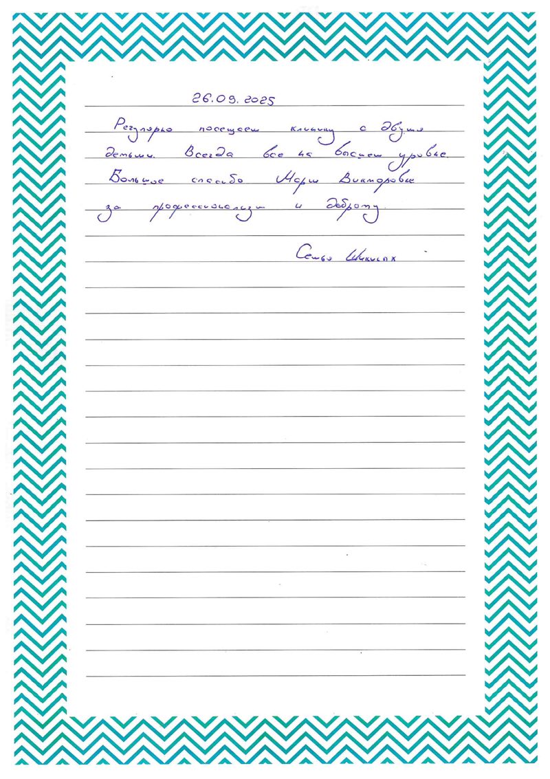 «Хочу выразить благодарность коллективу клиники на Луначарского и особое спасибо доктору Юшковой . С января 2025 года ежемесячно с ребенком посещаем и лечим кариес (4 года). Несмотря на сложное лечение, благодаря компетенции и подходу врача и коллектива у ребенка выработалось положительное отношение к стоматологии. Спасибо!»