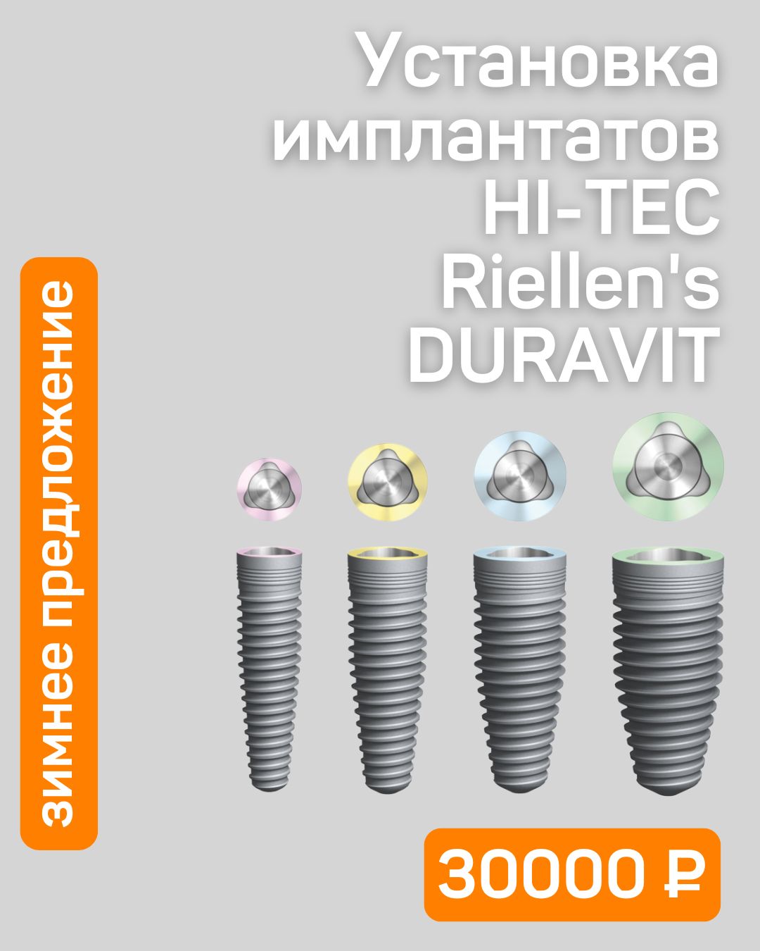 В клиниках НОРД ДЕНТАЛ установка имплантатов HI-TEC, Riellen’s и DURAVIT стоит 30000 рублей